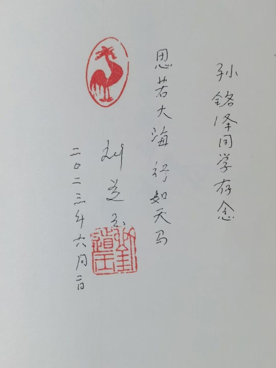 偶然一次“出错”,被2020级的孙铭泽遇到了。2022年,刘道玉已搬到校外养老院,孙铭泽辗转找到了他的住处,和他交流了许久关于人生与教育的想法。签名赠言时,刘道玉把他的名字写成了“孙恩泽”。后来,刘道玉发现了错误,在微信上和孙铭泽打趣说:“我把你的名字写成了孙恩泽,也好,寓意恩泽如海!”