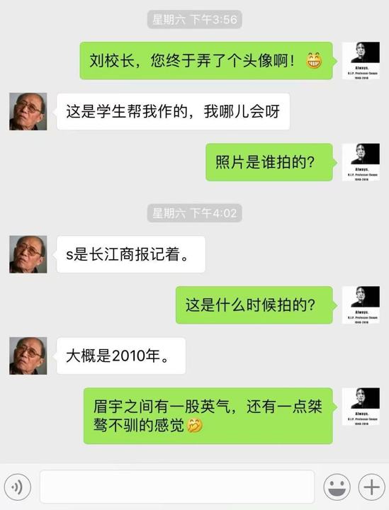 刘道玉很早学会了用微信,微信名是早年学生给他取的昵称“刘道”。即使到了生命最后几个月,他已不能写作,微信上回复学生的速度依旧很快。